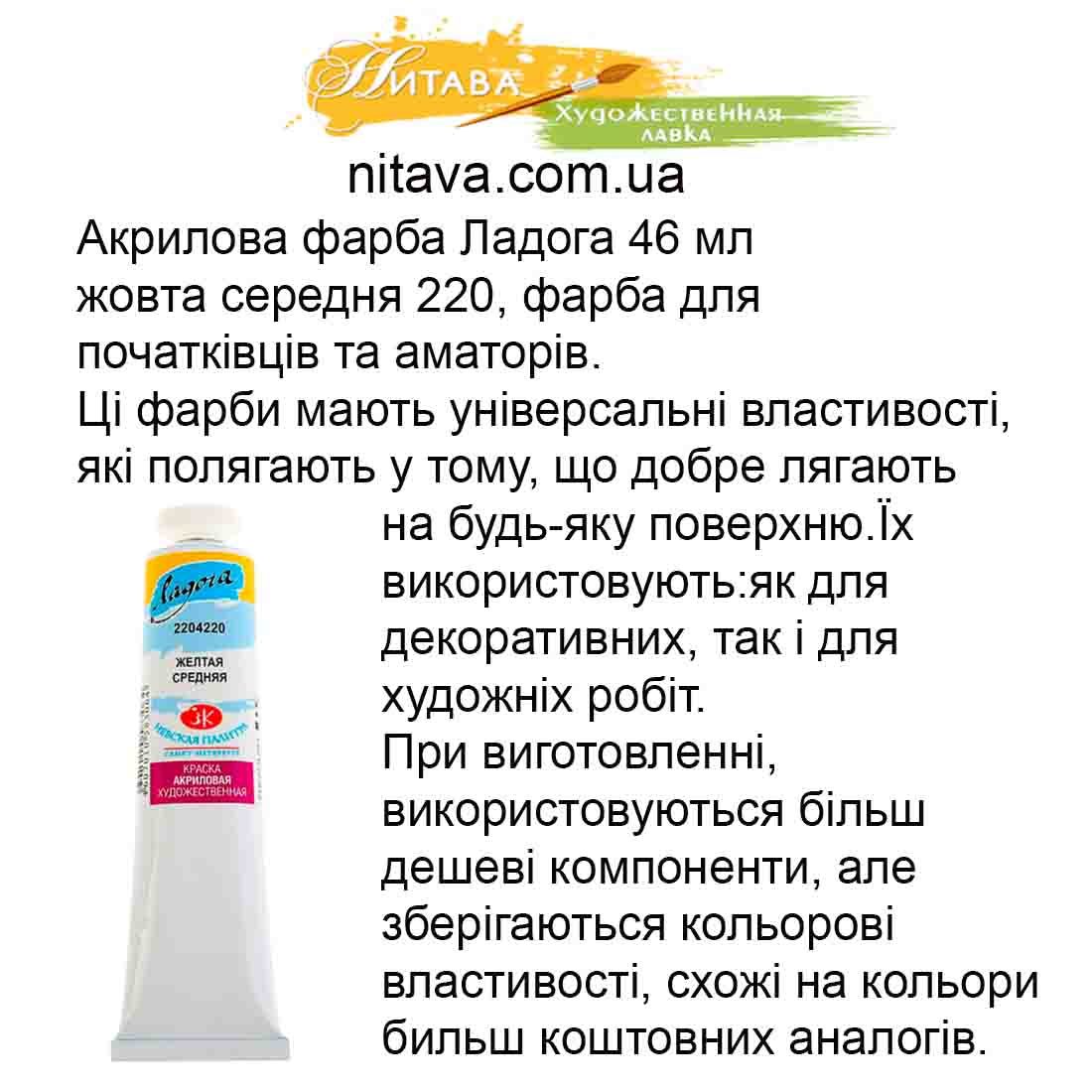 Якщо Вам, чомусь не підійшла фарба акрилова Ладога 100 мл жовта середня 220 подивіться цю: Акрилова фарба Ладога 46 мл жовта світла 213