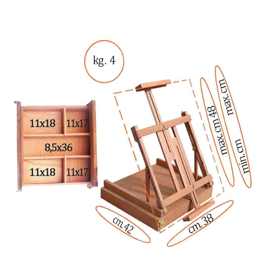 Размеры этюдника имеют в высоту – 50 см. глубину – 12 см. и ширину – 42 см.