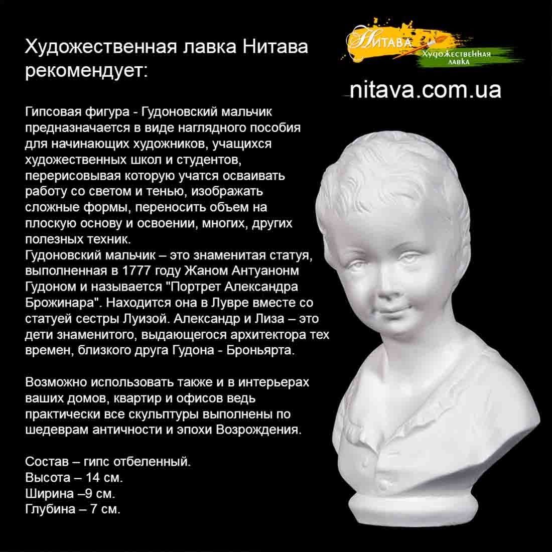 Гипсовая фигура – Гудоновский мальчик, бюстик, предназначается в виде наглядного пособия для начинающих художников.