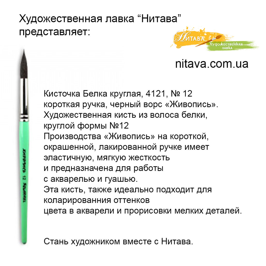 Кисть белка круглая 4121 № 12 «Живопись» из волоса белки, черного цвета и круглой формы №12 производства «Живопись», Китай.