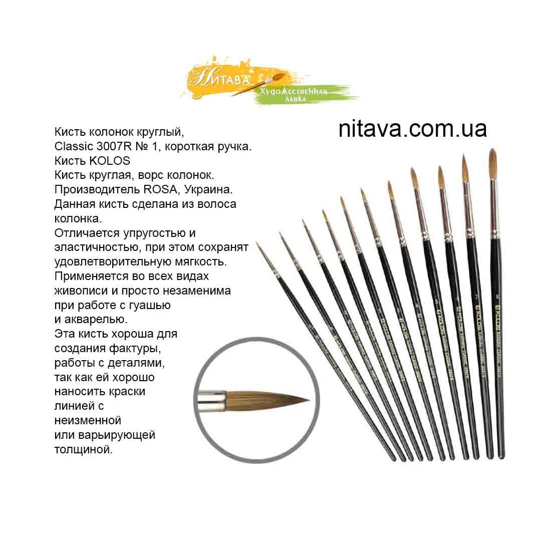 Кисть колонок круглый Classic 3007R № 1 KOLOS, ворс колонок, короткая ручка, производитель ROSA, Украина.