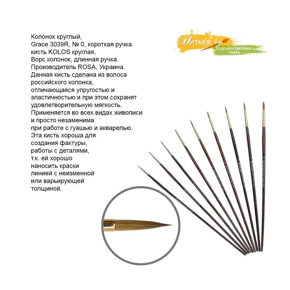 Кисть колонок круглый Grace 3039R № 0 KOLOS, ворс колонок, длинная ручка, производитель ROSA, Украина.
