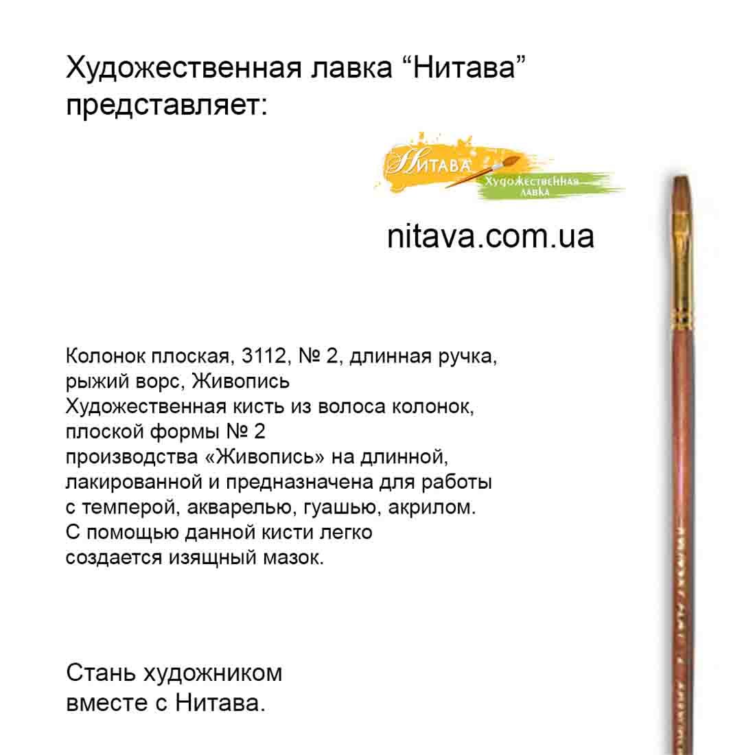 Кисть колонок плоская 3112 № 2 Живопись из волоса колонок, рыжий ворс, плоской формы, производства «Живопись», Китай.