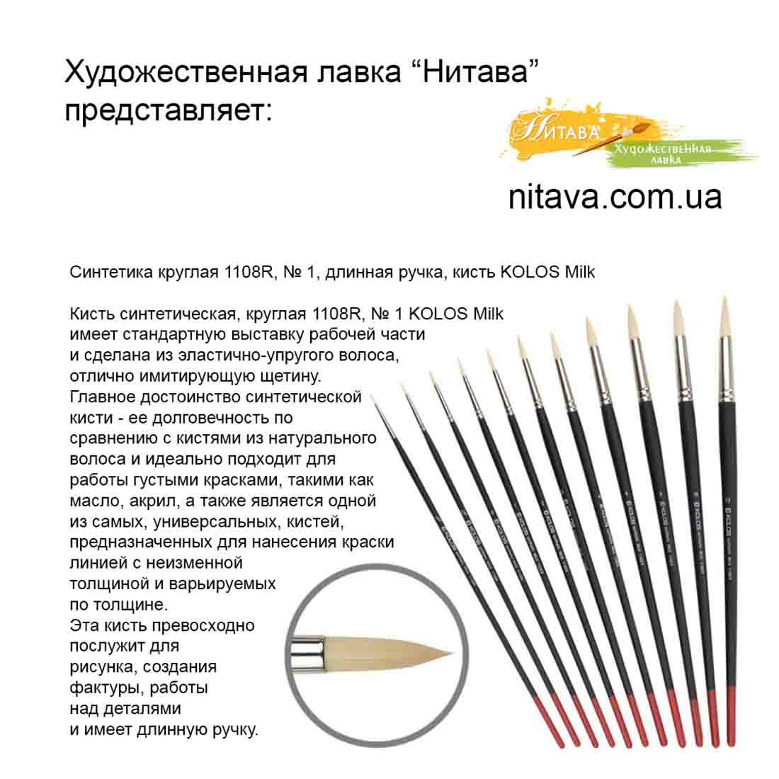 Кисть синтетика круглая 1108R №1 KOLOS Milk имеет стандартную выставку рабочей части и длинную ручку.