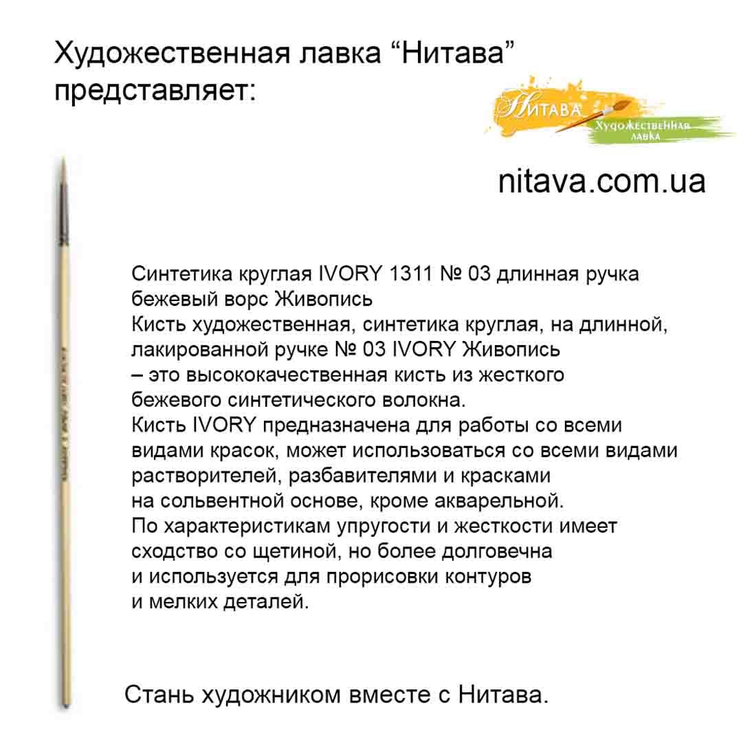 Кисть синтетика круглая IVORY 1311 № 03 Живопись – синтетика круглая, на длинной, лакированной ручке.