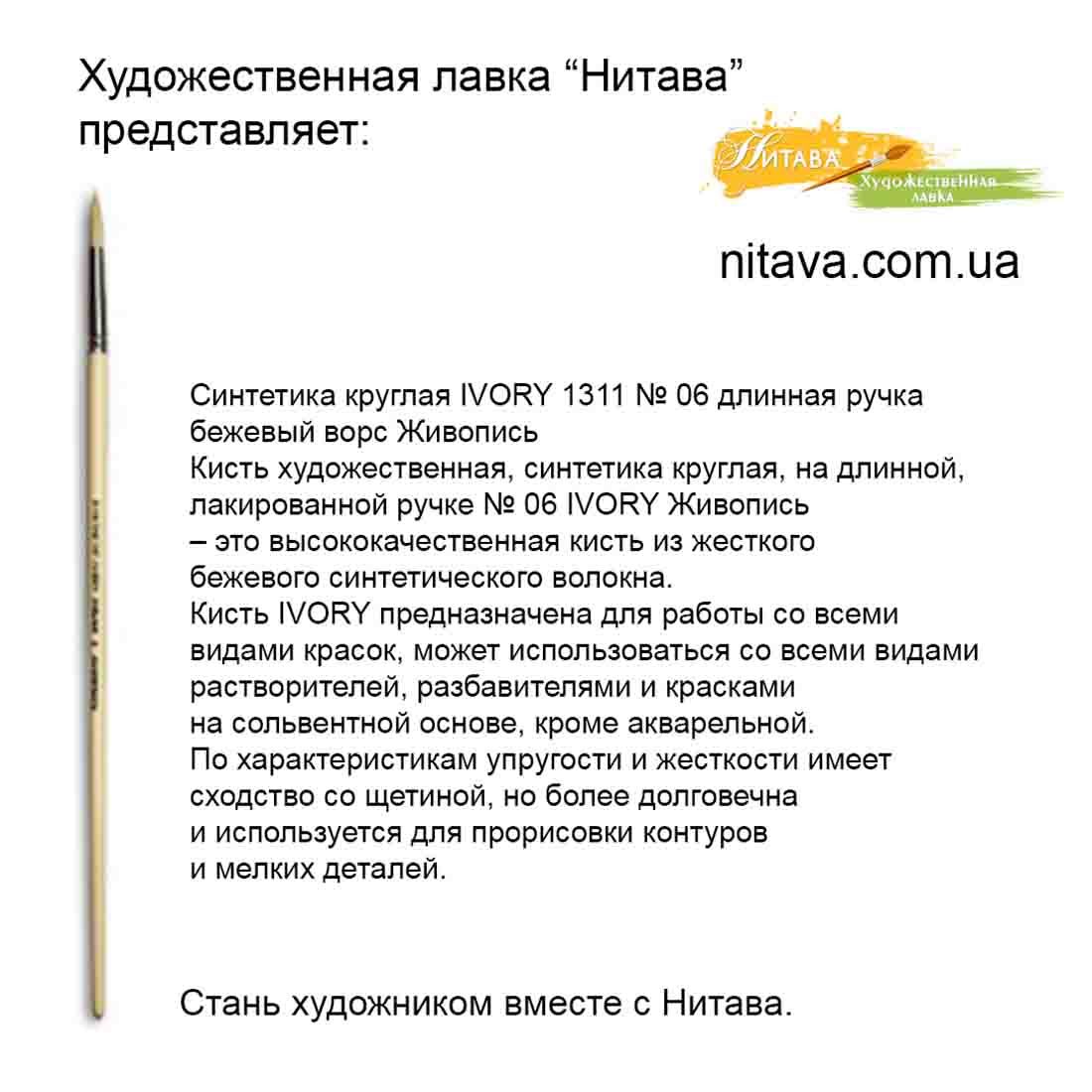 Кисть синтетика круглая IVORY 1311 № 06 Живопись – синтетика круглая, на длинной, лакированной ручке.
