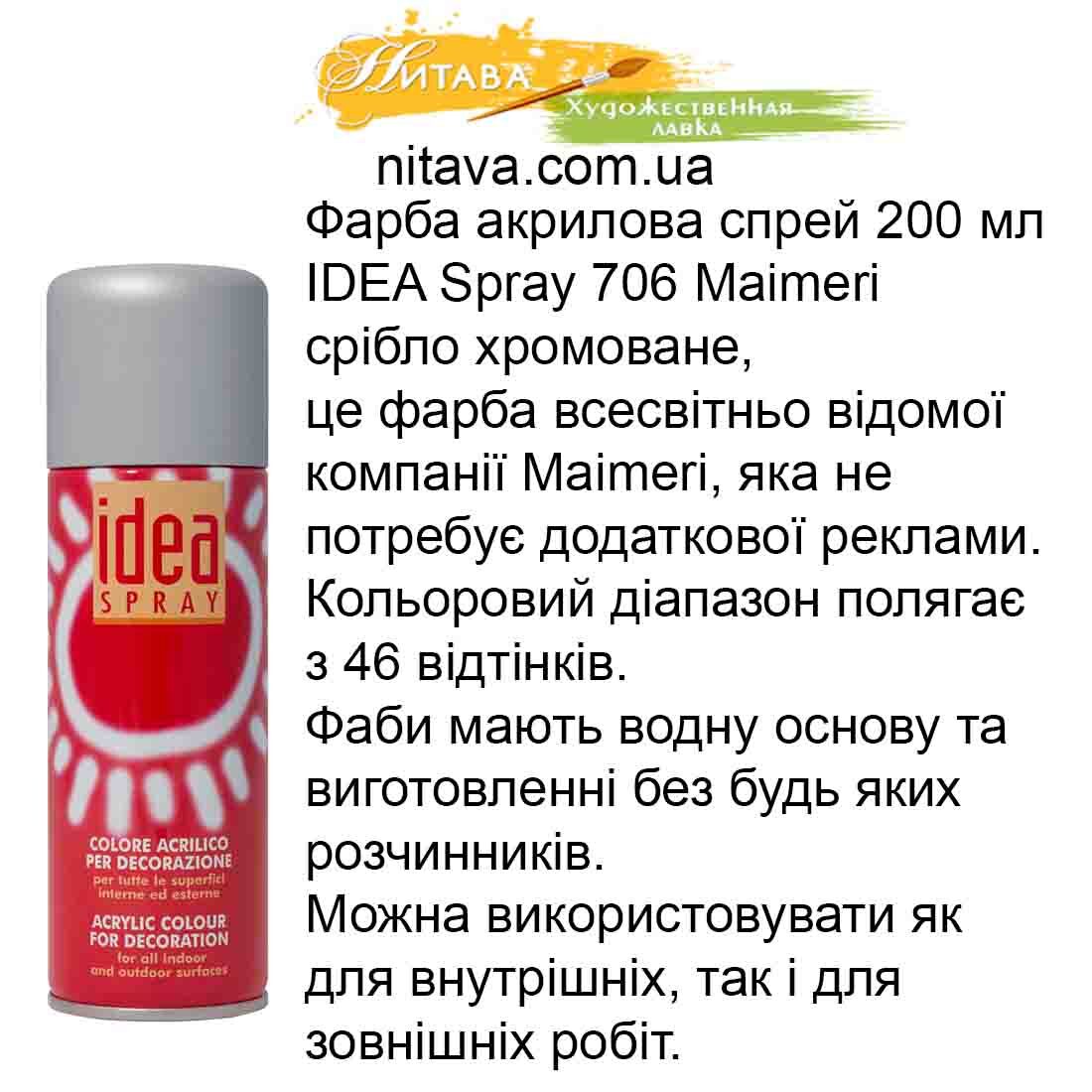 Фарба акрилова спрей 200 мл IDEA Spray 706 Maimeri срібло хромоване, це фарба всесвітньо відомої компанії Maimeri, яка не потребує додаткової реклами.