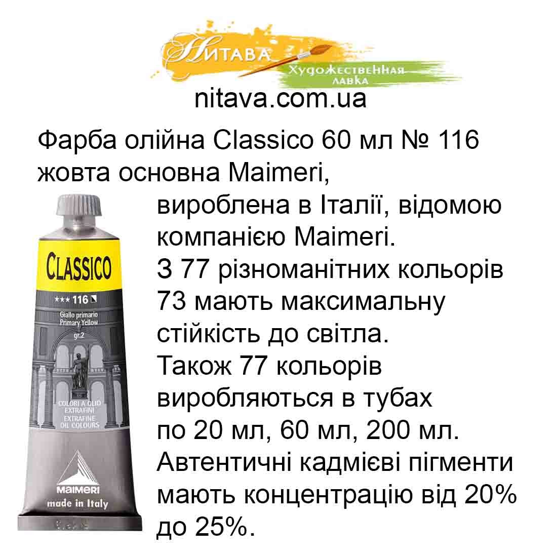 Фарба олійна Classico 60 мл № 116 жовта основна Maimeri, це олійна фарба вироблена в Італії, відомою компанією Maimeri.